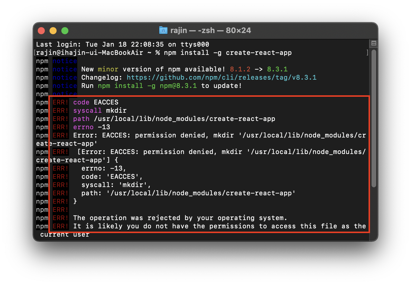 우선 terminal.app를 열어서 node -v와 npm -v를 통해 잘 설치되었는지 버전확인을 해본다.